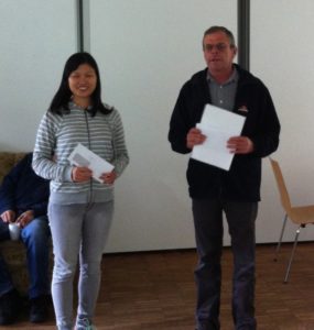 Das Turnier wurde wie im Vorjahr von unserem Mitglied Liang Tian (4d, Karlsruhe) mit 5:0 klar gewonnen. Auf Platz 2 folgte die Stuttgarterin Chu Lu (4d) mit 4:1 und der neue und alte Bayerische Go-Meister ist (diesmal auf Platz 3) Jonas Fincke (4d, München) mit 3:2.