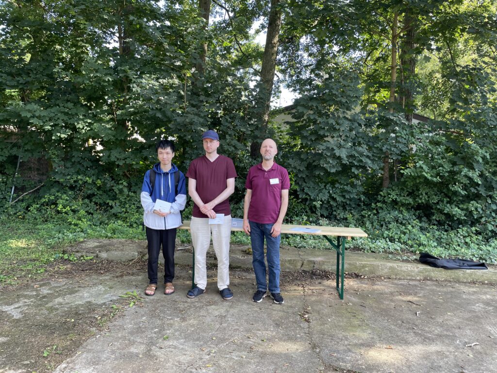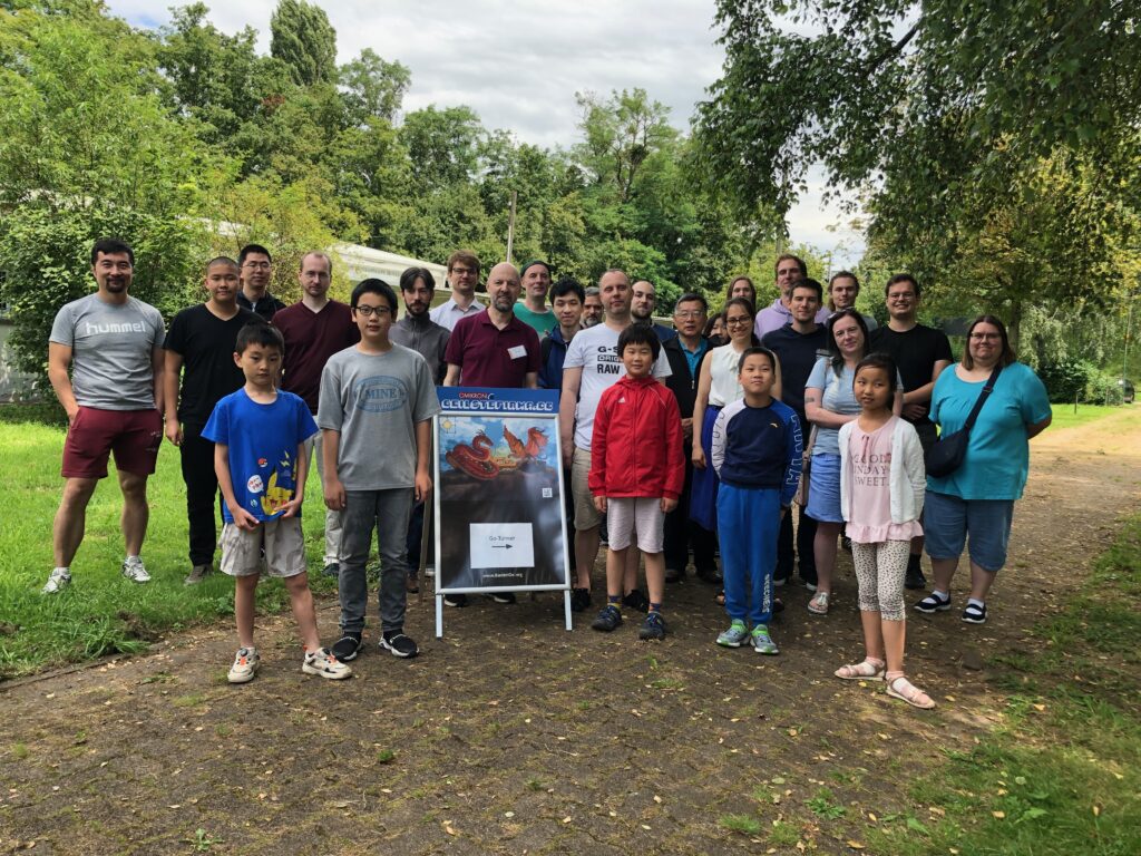 Bei für Karlsruhe kühlen 25° Grad spielten insgesamt 28 Spieler, aus 8 Clubs. Für 2 Spieler war es auch das erste Turnierspiel, darunter Herr Ming He, der mit Sohn und Enkelsohn mitspielte und seine Freunde am badischen Turnierformat hatte. Sein Sohn Chao He ist Co-Organisator für das SamschdigGo in Wendlingen am Neckar und so war er gut vorbereitet. Herr He spricht nur Chinesisch, aber das war kein Problem, Go ist das Gespräch der Hände.