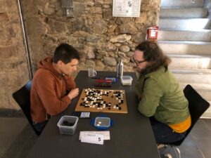 Neben dem Landesverband hat die CK Holding aus Pforzheim das Turnier finanziell unterstützt, und so gab es auch wieder die beliebten Omikron-Tassen. Um Wartezeiten zu überbrücken, stand wieder unser Roboter Anton gerne bereit für eine Partie Gospiel. Im Nebenraum gab es für die Spieler die Möglichkeit ihre Spiele nachzubesprechen. An einem 9×9-Tisch zeigte Wilhelm mithilfe der Straßburger Regeln und unserem Bierdeckel zwei Interessierten Gästendas Gospiel.