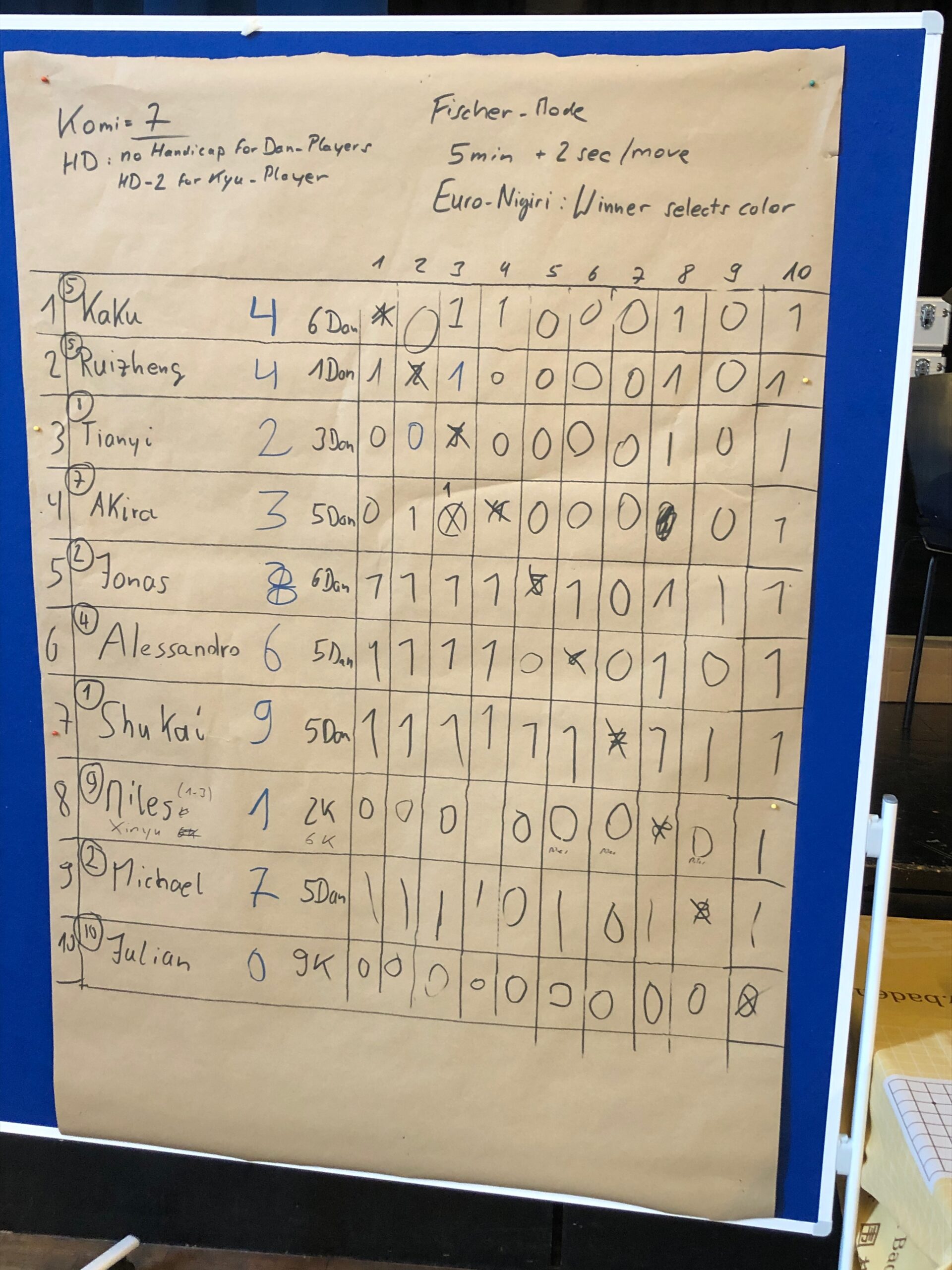 Der Sieg ging an Kaku Maekawa (6d, Köln) knapp vor Shukai Zhang (5d, Frankfurt/Main) und Xinghong Chen (5d, Düsseldorf), beste Spielerin war Akira Maekawa (5d, Köln) auf Platz 4.