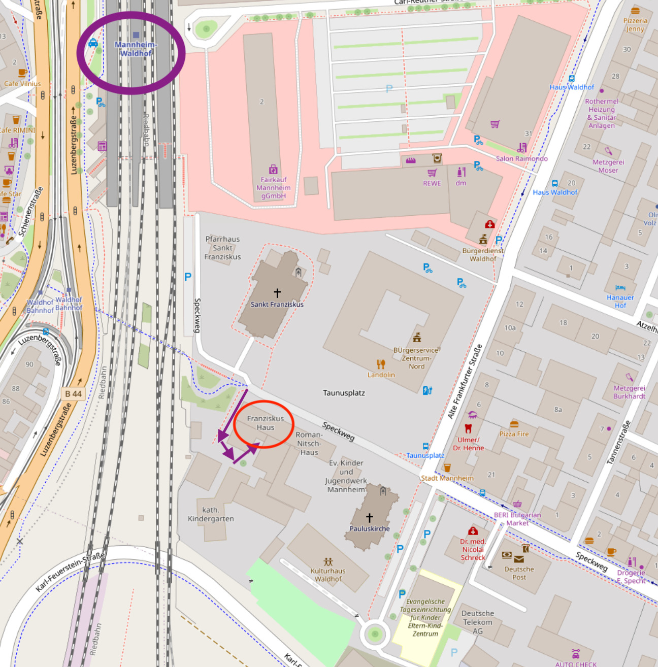 S-Bahnhof Mannheim-Waldhof ist direkt nebenan.